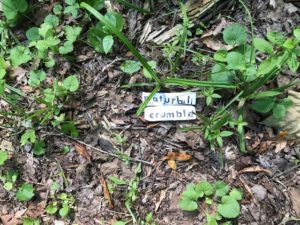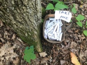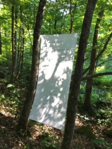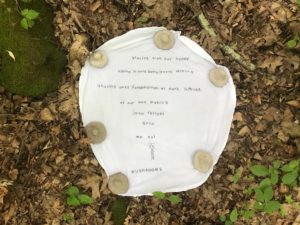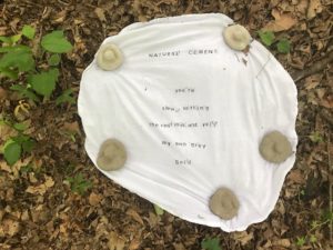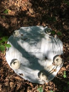The day of the opening, I marveled at the glass, stone, wood, metal, and other fashionings that were 22 different artists’ interpretations of curator Jeff Benjamin’s Eotechnic Sensorium. I enjoyed peeking over at people who lingered at Lines in the Woods, but I hoped no one tried too hard to puzzle out the layers of meaning. Instead I hoped they’d watch how the cloth made sense of a gust of wind or water ripple, like others who have noticed the shock of white cloth against the greys, browns and greens of woods. I wondered if, over time, the stamped ink would fade, the muslin would stain brown, green, maybe even pink with dirt, leaves, and mold. The ground poems might cover entirely over with earth, twigs and grass, and the hanging pieces rip in the windstorms. The baskets of word pillows would empty. All this would be much in keeping with domestic work, with its ephemeral quality and tendency to wear out, to use up, to need replenishing. But when I visited a month later, I was moved to see how new the cloth still looked; how, even if they’d been splashed with dirt spray during a heavy rain, the rains had also washed the cloths clean, the wind and sun had dried them flat again. Even the pieces on the ground maintained a glowy white around the circles of stains from the cement mushrooms I’d made. One visitor, instead of taking away their word pillow, had made a mini-poem on the ground with two: natural crumble. I thought this was wonderful, and left it.