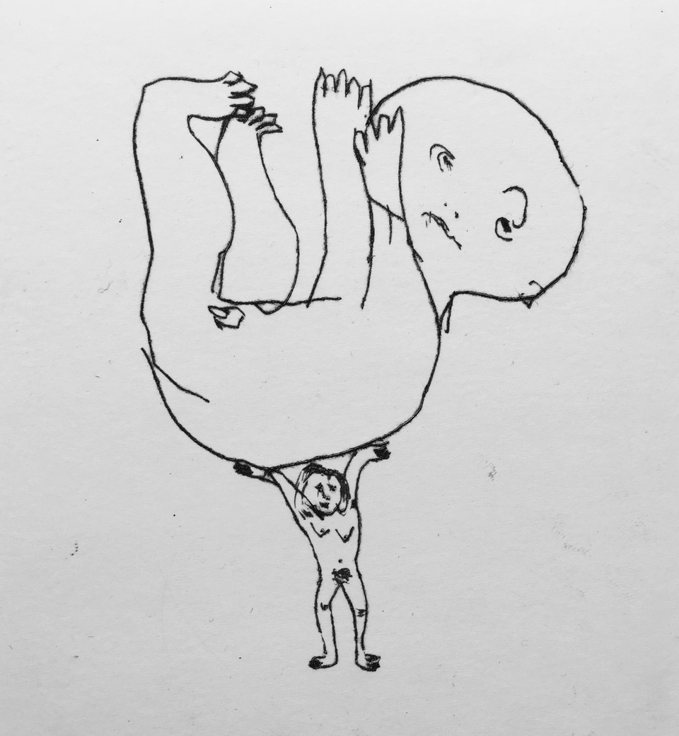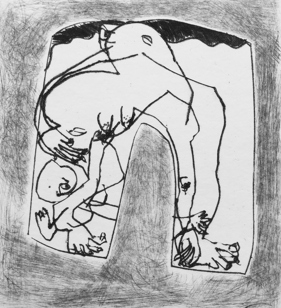 The works are from a series that reflect different moments in a day as a mother and child interact. These drypoints required firm pressure to engrave lines into perspex sheet before the inking and printing processes. This firm contact is essential for the lines I make, which are scratched or rubbed into a surface.
