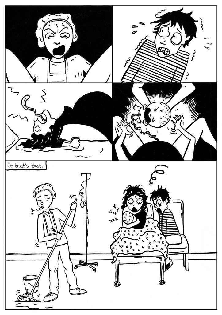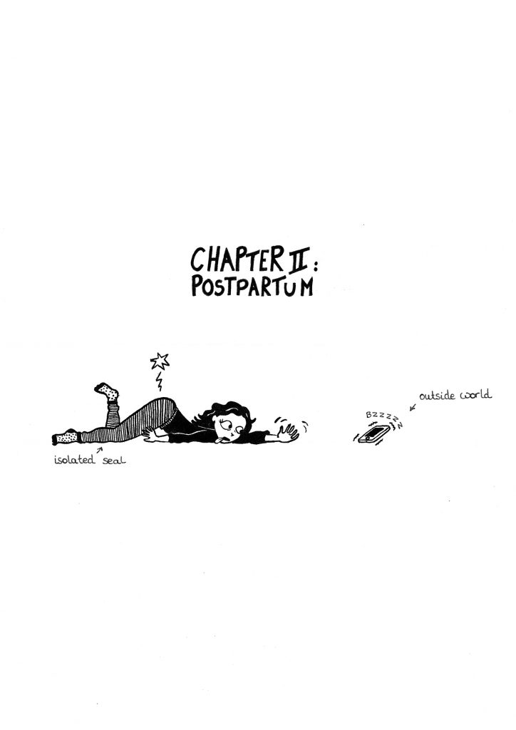 The second chapter of A Journey to Motherhood focuses on the postpartum period. Overall the comic book makes testimony to all the aspects of society that one witnesses when becoming a parent such as maternity, childcare, working parents, health, finance and education with a wry and cynical twist. It is a rebellion against the “how-to” parenting guide and the injunction to be a perfect mother.