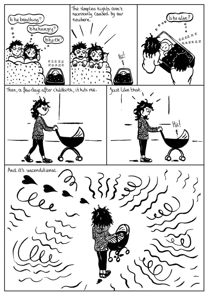 I am a French illustrator and cartoonist based in Bristol, UK. I explore the subject of motherhood in my artwork, and more particularly through my comic book A Journey to Motherhood. The project was this year long listed for the Laydeez Do Comics Prize. As a side project to this long form graphic novel, my self-published book of cartoons Toddler Moments was selected as part of the April line-up for the Laydeez do Comics event where I was invited to present the project to the public. The book was recently reviewed in Broken Frontier and described as a “witty spin on the trials of parenthood”.