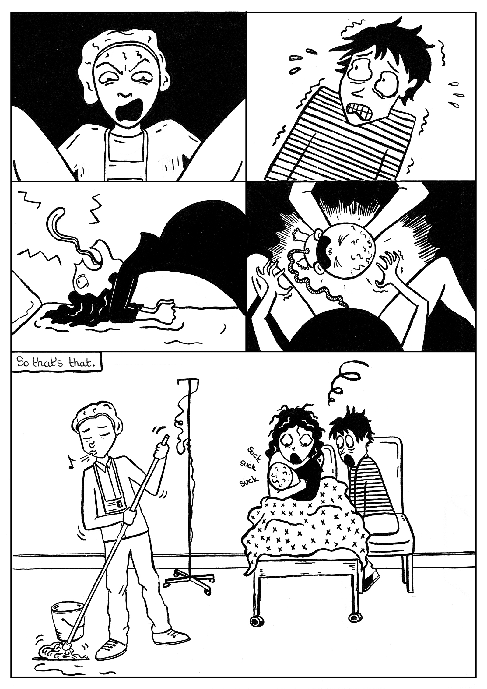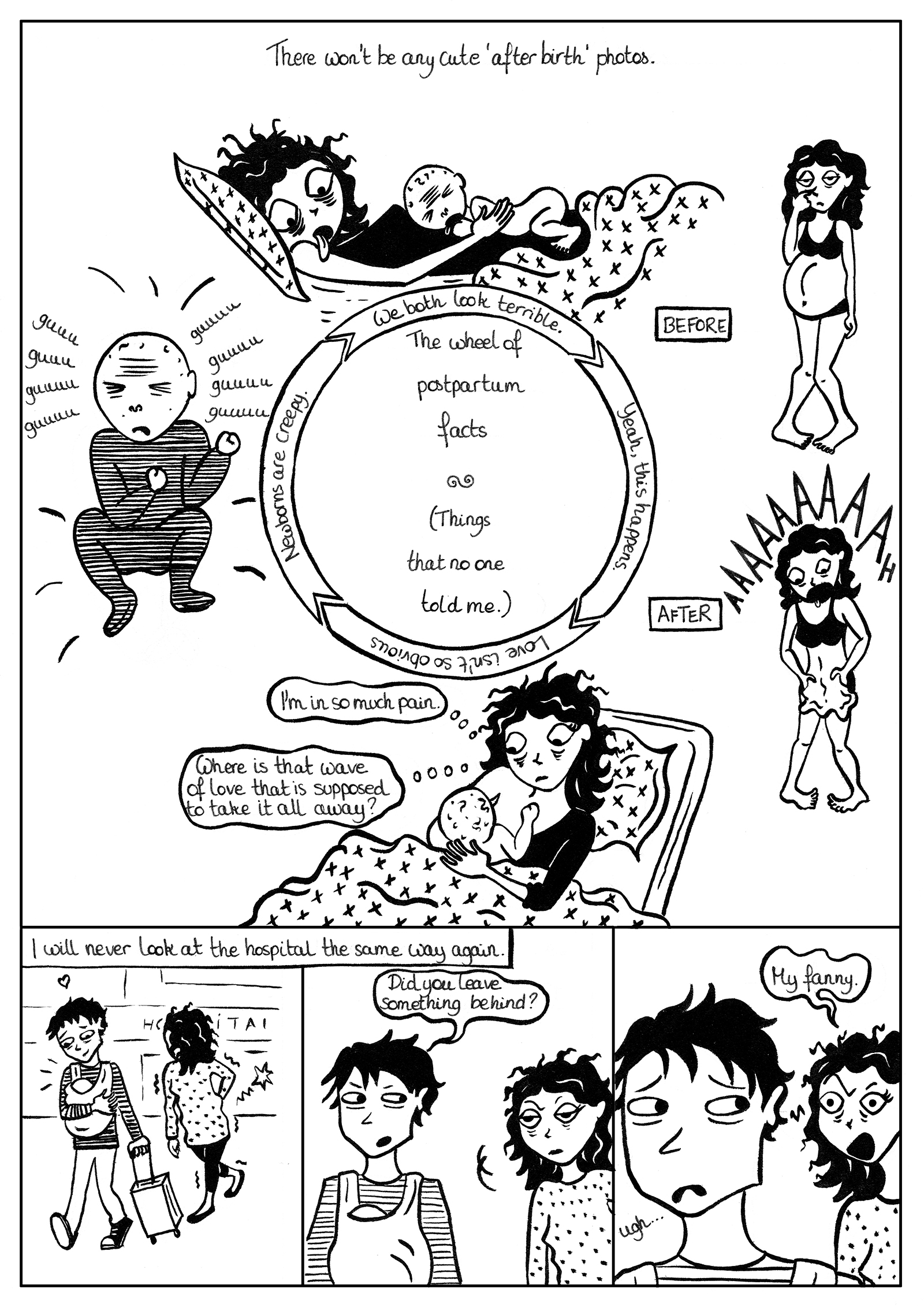 The second chapter of A Journey to Motherhood focuses on the postpartum period. Overall the comic book makes testimony to all the aspects of society that one witnesses when becoming a parent such as maternity, childcare, working parents, health, finance and education with a wry and cynical twist. It is a rebellion against the “how-to” parenting guide and the injunction to be a perfect mother.