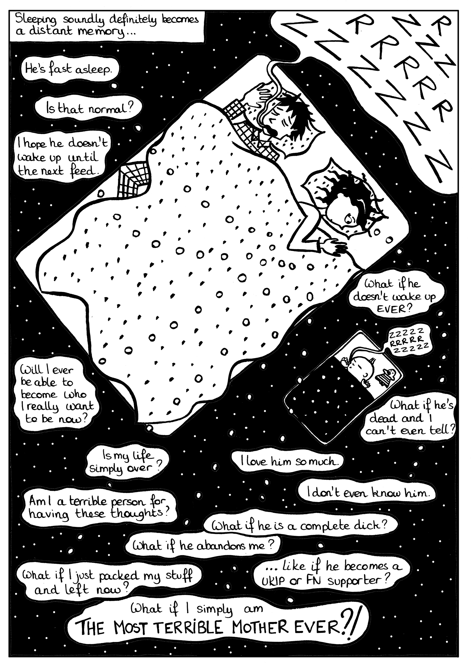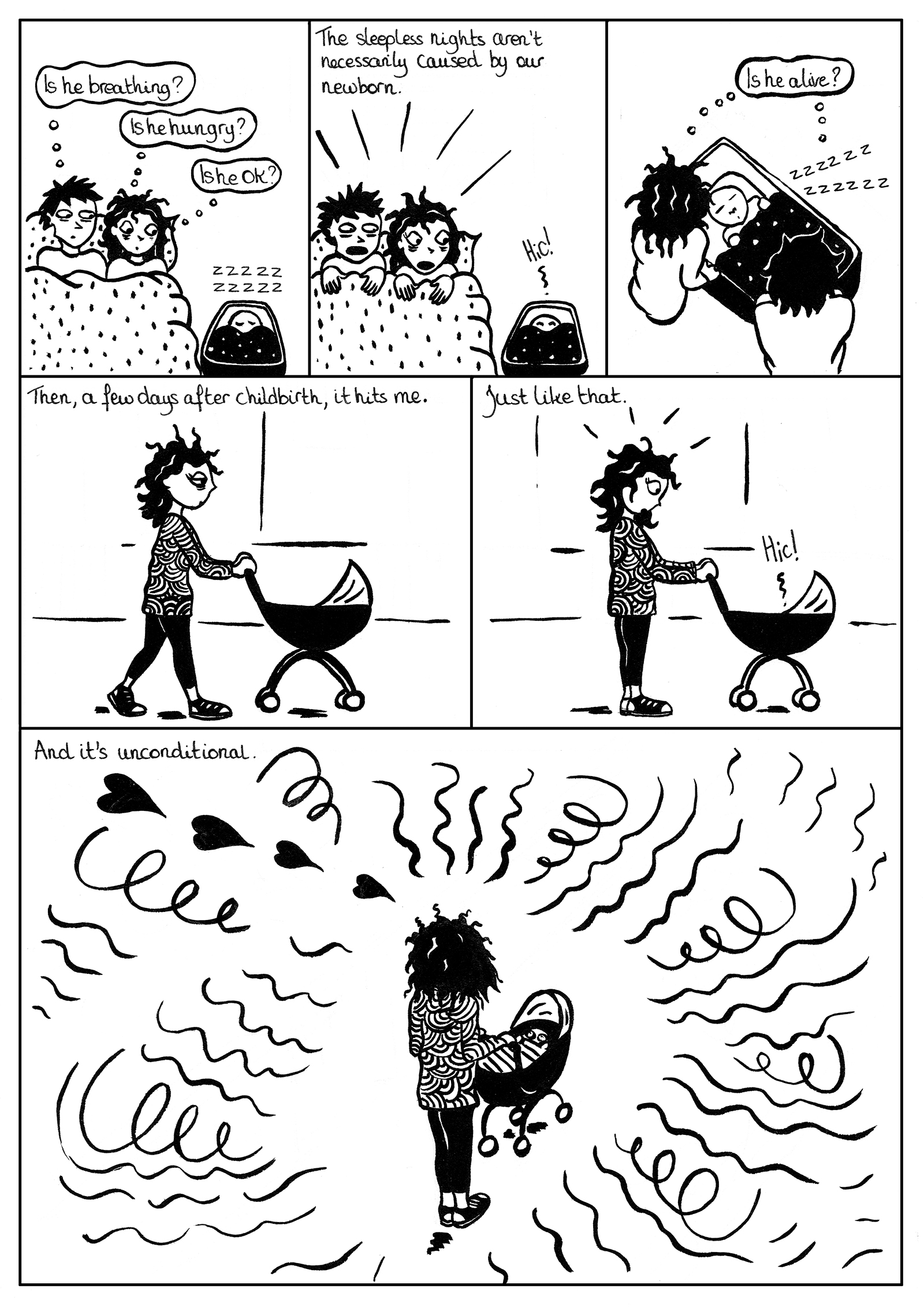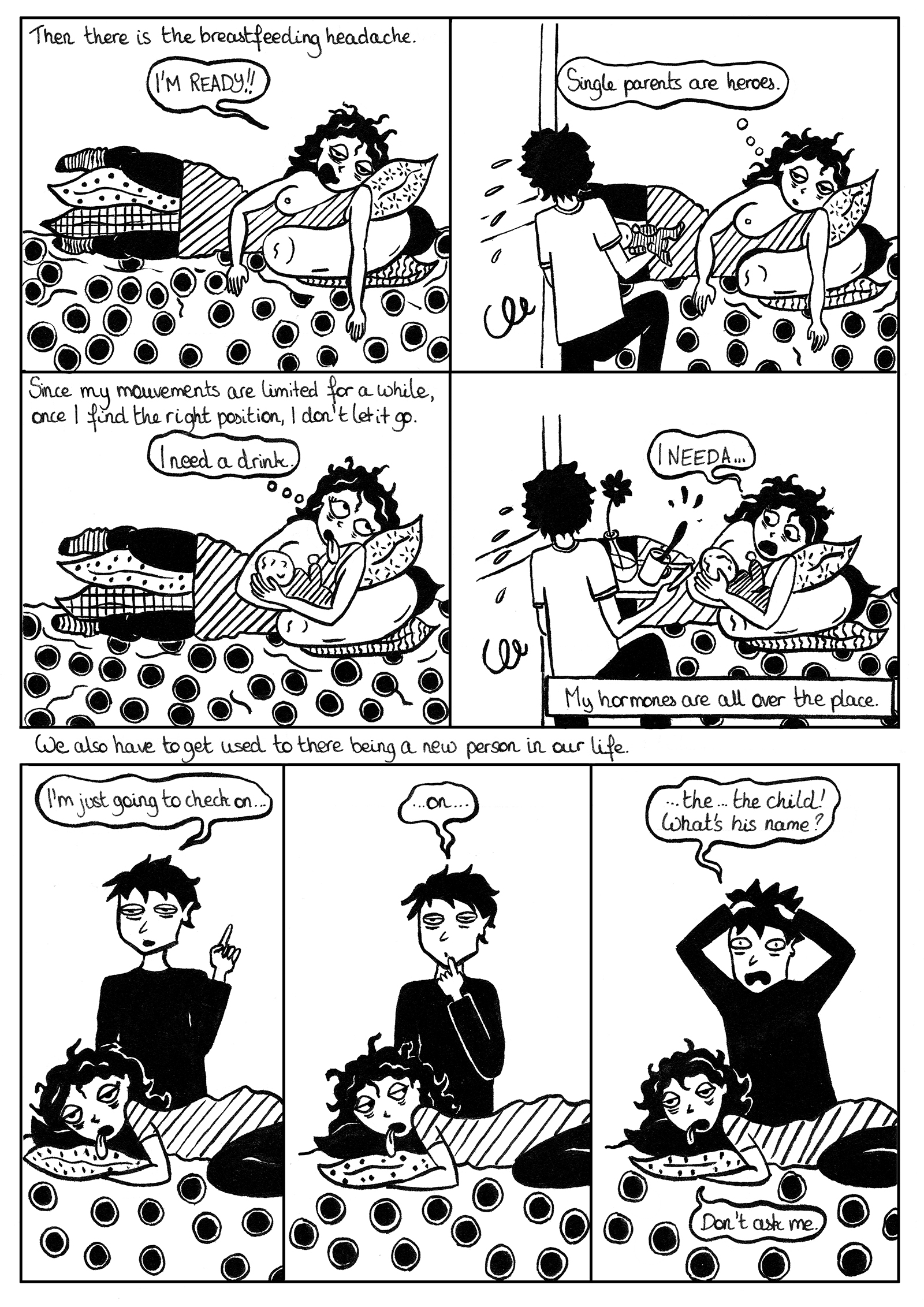 I am a French illustrator and cartoonist based in Bristol, UK. I explore the subject of motherhood in my artwork, and more particularly through my comic book A Journey to Motherhood. The project was this year long listed for the Laydeez Do Comics Prize. As a side project to this long form graphic novel, my self-published book of cartoons Toddler Moments was selected as part of the April line-up for the Laydeez do Comics event where I was invited to present the project to the public. The book was recently reviewed in Broken Frontier and described as a “witty spin on the trials of parenthood”.