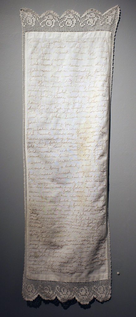 wash, dry, fold, repeat and invisible labor #1 explore aspects of the labor and complex psychological experience of pregnancy, child development and mothering. By using the slow methodical process of hand embroidery I reference the slow, methodical labor of being a mother. It is done in white thread to acknowledge that these acts of love and labor are often invisible to others and society.