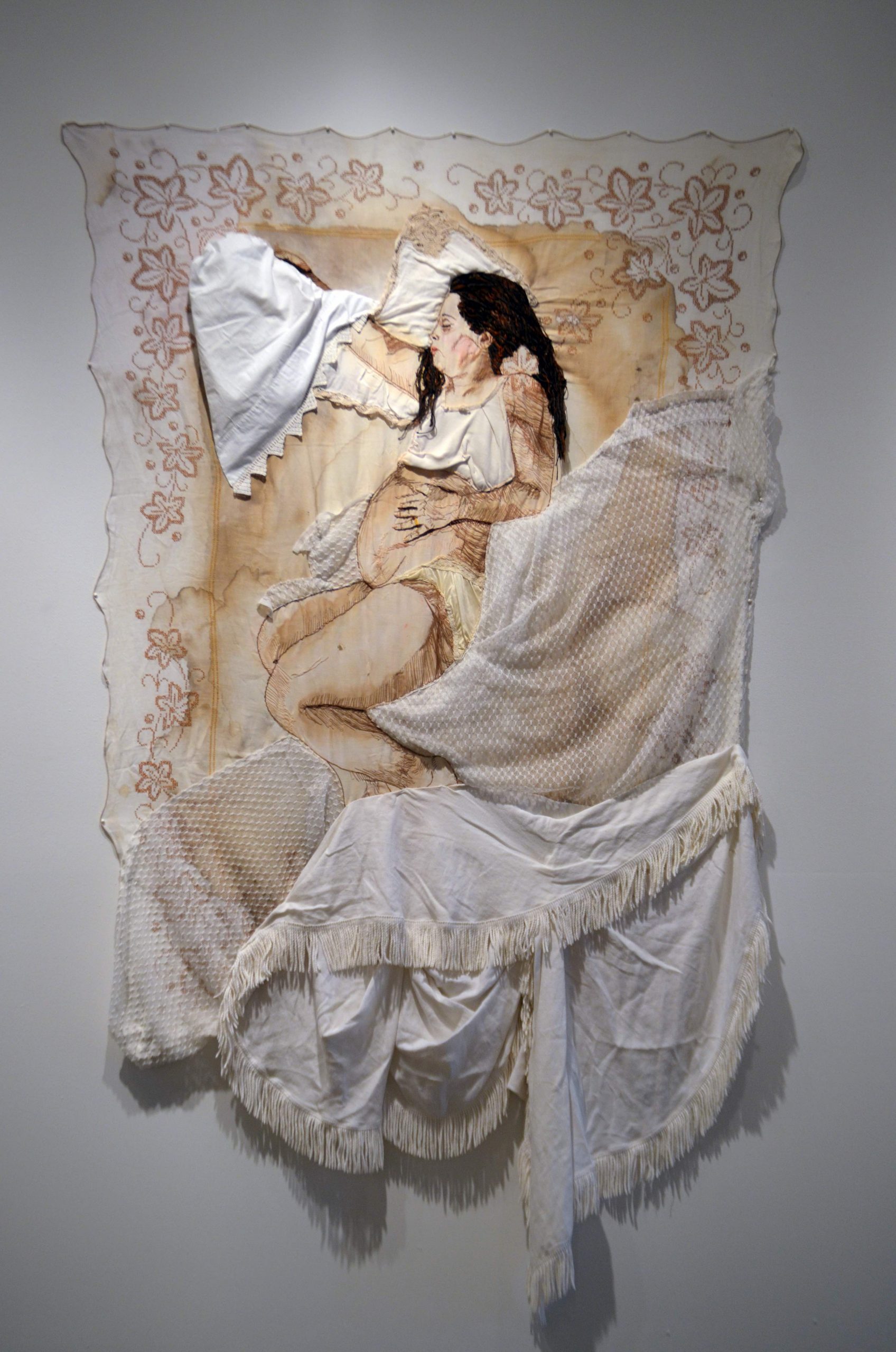 The work 8 months is from a larger series where I explore the liminal space of the body and the bed. This specific piece is of a highly pregnant woman cocooned within the womb of her body and the bed.