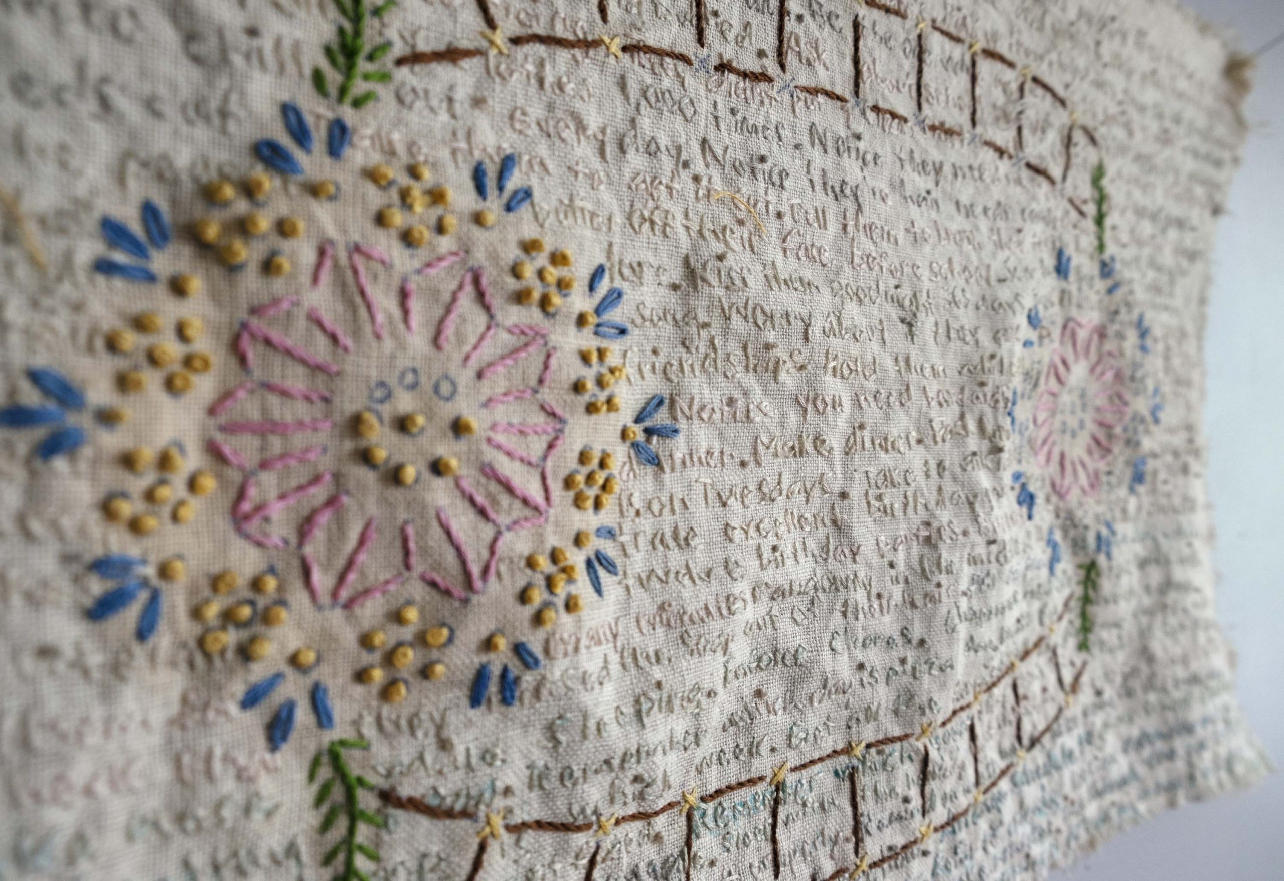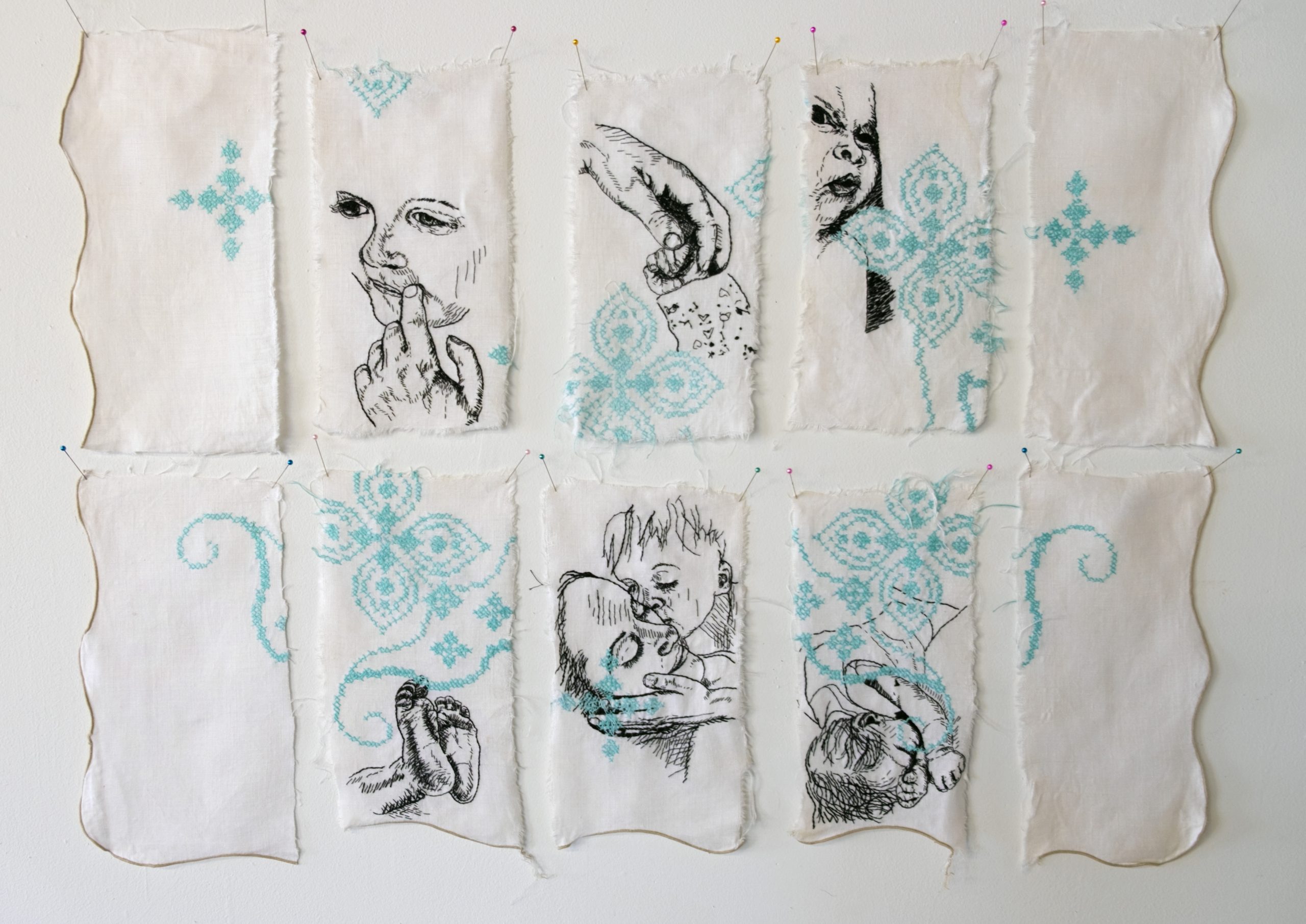 wash, dry, fold, repeat and invisible labor #1 explore aspects of the labor and complex psychological experience of pregnancy, child development and mothering. By using the slow methodical process of hand embroidery I reference the slow, methodical labor of being a mother. It is done in white thread to acknowledge that these acts of love and labor are often invisible to others and society.