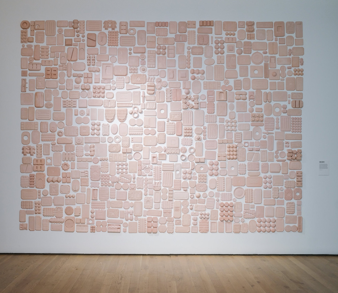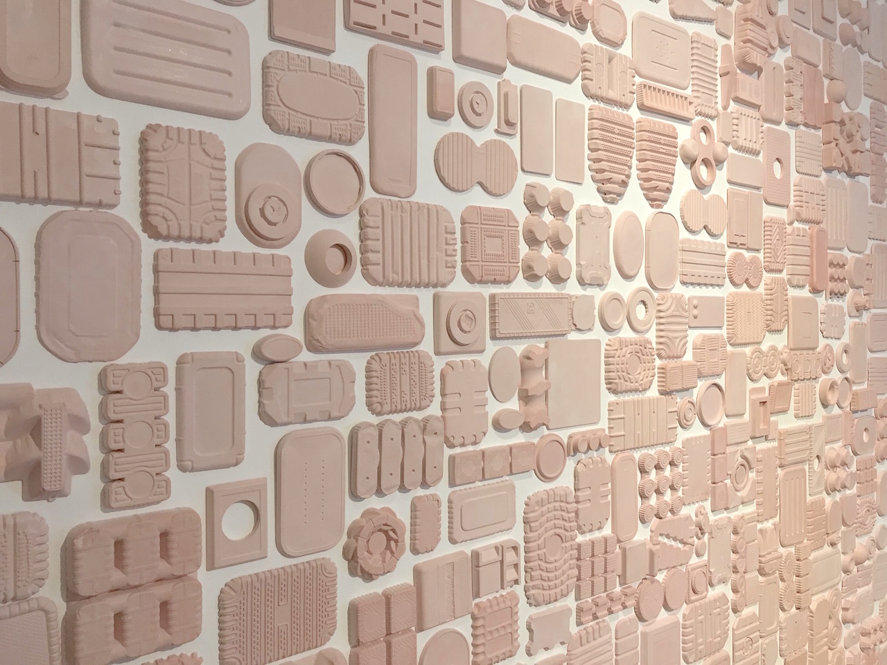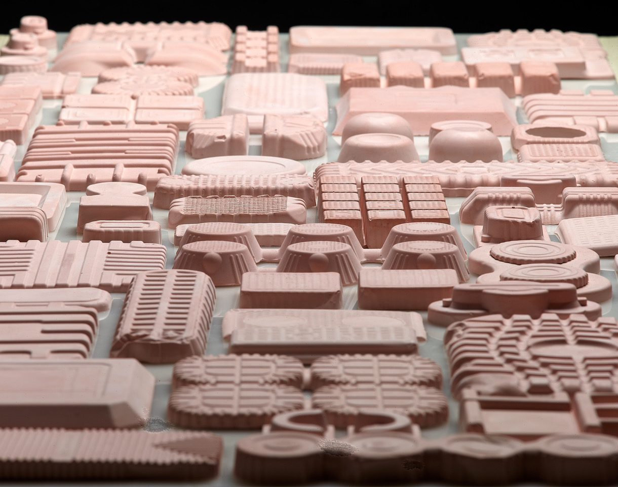 The installation can be arranged in many different ways, depending on the demands of the given site. The current install at York Art Gallery covers a wall 4 meters wide and three meters high. I chose dental plaster because of it’s finer quality and ability to pick up every detail from the surface of the packaging. I also like the conceit that, as it’s used to cast teeth, there’s a link to eating and food.