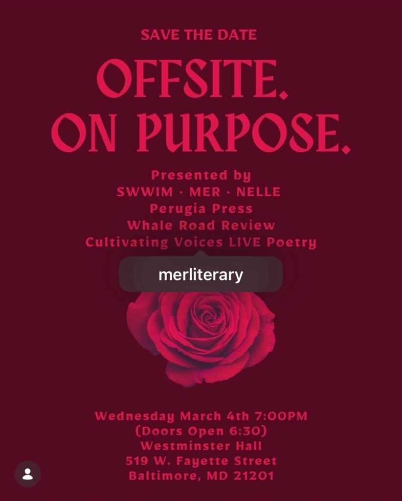 SWWIM, MER, NELLE, Whale Road Review, Perugia Press, & Cultivating Voices LIVE Poetry present “Off Site. On Purpose,” featuring many of today’s most inspiring women and nonbinary writers and poets! Join us for a night of life-affirming poetry on Wednesday, March 4, 2026 at 7:00 PM (Doors open at 6:30 PM), Westminster Hall, 519 W. Fayette Street, Baltimore, MD 21201. Admission is free. Cash bar available. No RSVP needed; just come!