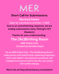 “The (Re)Birthing Room,” seeks poetry (up to three poems in one document) and hybrid works (of 750 words or fewer) exploring pregnancy, birth, and rebirth—the physical, emotional, and metaphorical spaces where new life, new selves, and new worlds emerge, for an MER Online Folio. Open for submissions Dec. 1 through 7, 2025.